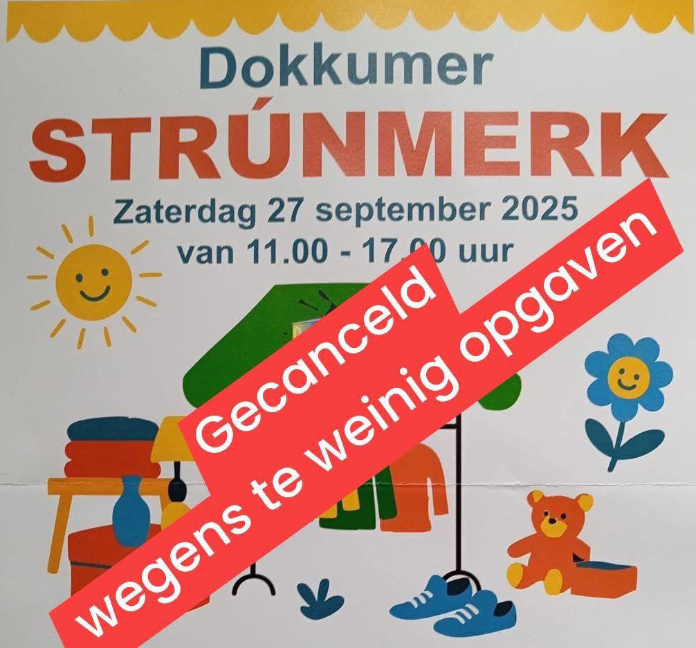 Op zaterdag 27 september a.s. vindt de eerste Dokkumer StrúnMerk bij De Groen plaats! Deze gaat dus helaas niet door. Samen met de Wijkraad Hoedemakerspolder wordt het terrein rondom De